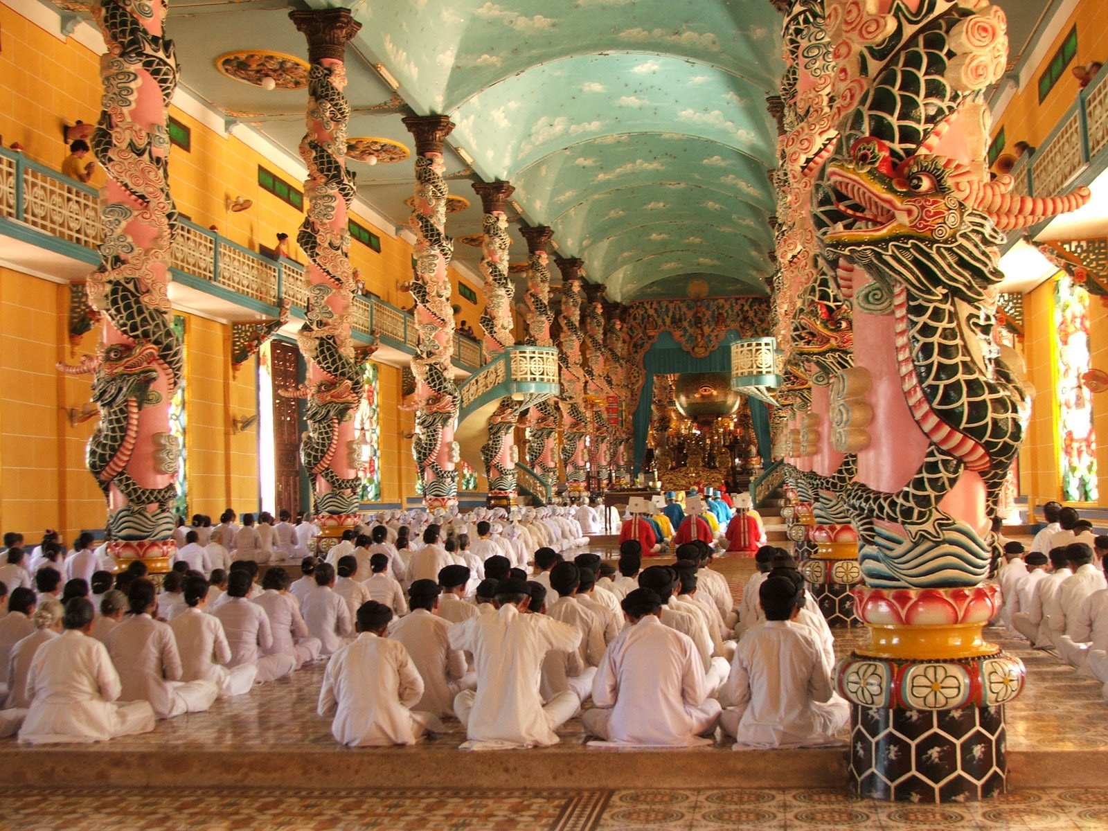The whole ceremony was these people of different beliefs bowing and reciting words. The majority of the people were waring white, but there are others wearing blue, red, etc. where each color represented a difference culture and beleif.