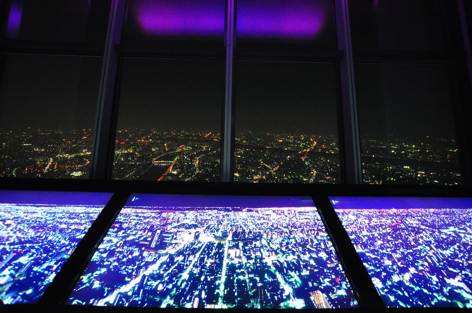 We bought our tickets and took the elevator to the first observation deck which sits at a height of 350 meters. When the doors open you’re greeted with a nice panoramic view of Tokyo and it makes you realise just how big this city is, especially in comparison to Melbourne! The lights at night looked very nice and makes it easy to see just how far the city spans, but as the windows where angled up, not only is it hard to get a photo without reflections but there are purple lights everywhere that reflect down along the window. I also didn’t have a tripod (and don’t think they were actually allowed) so the photos don’t do the view justice.