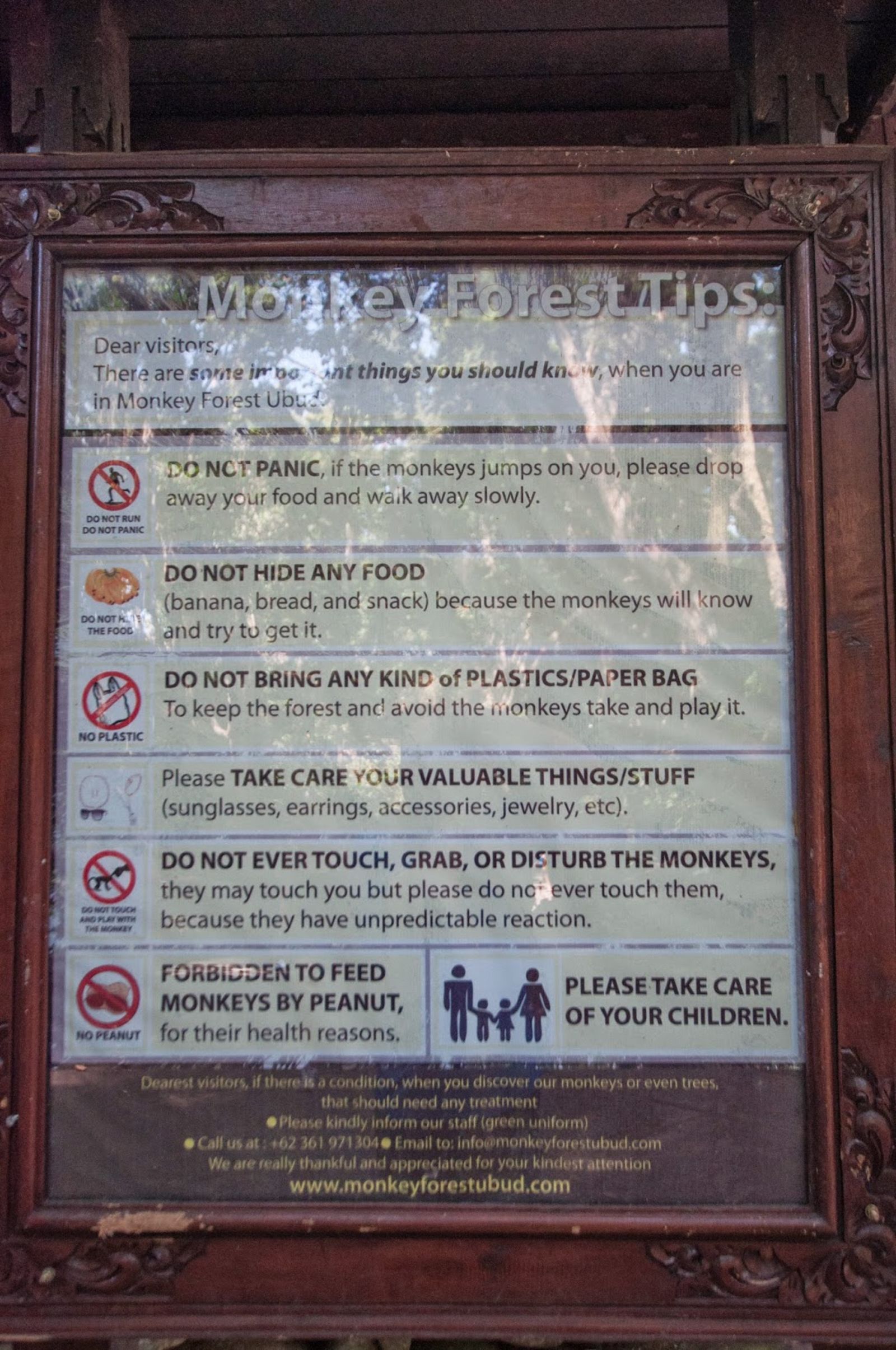 Throughout the forest you can buy fruit to feed to the monkeys. While the monkeys are not necessarily aggressive to humans, they won’t hesitate to climb you and snatch the food from you. There are warnings around the forest to not attempt to hide food from the monkeys because they will do whatever they can to get to it.