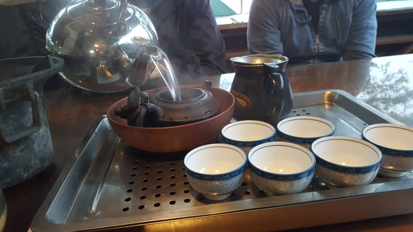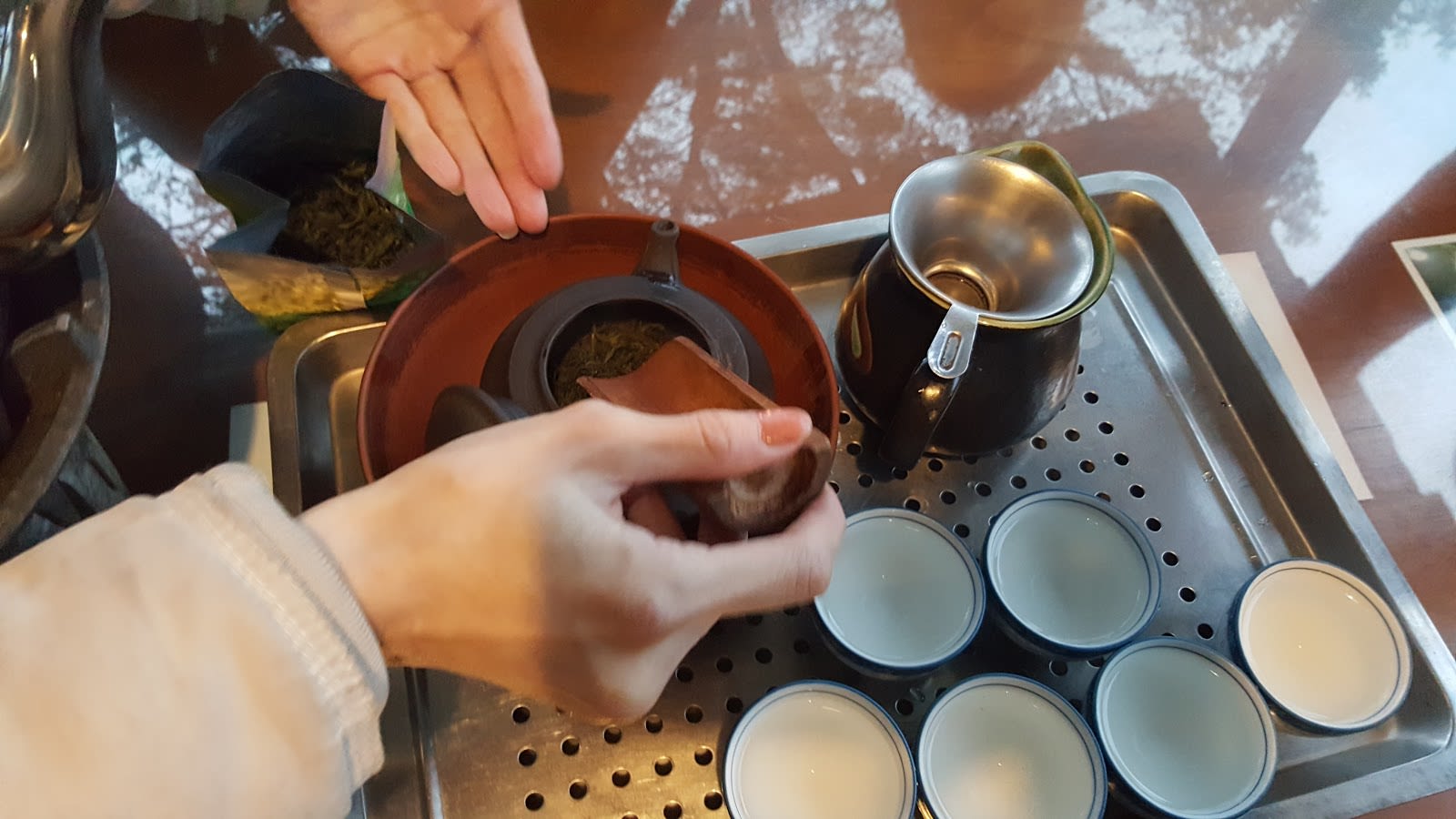 Once the water is hot, the lady used poured the hot water in to the cups and over the teapot to warm everything up. The teapot was in another bowl to keep it warm from the hot water that had been poured over it. The hot water was then poured into the teapot and gave us a rough guide for how long to let it brew for before pouring our cups.