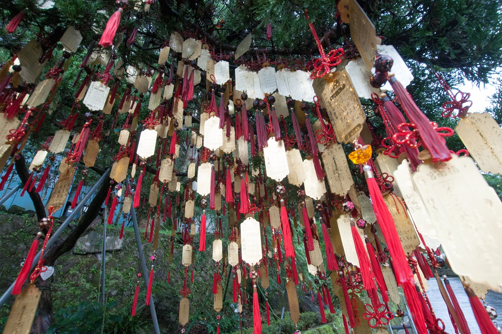 After a few photos we made our way down to the actual temple with was much more extravagant. Along the way there were all these small, red cards hanging off the trees. We later found out that these are wishes for the new year.