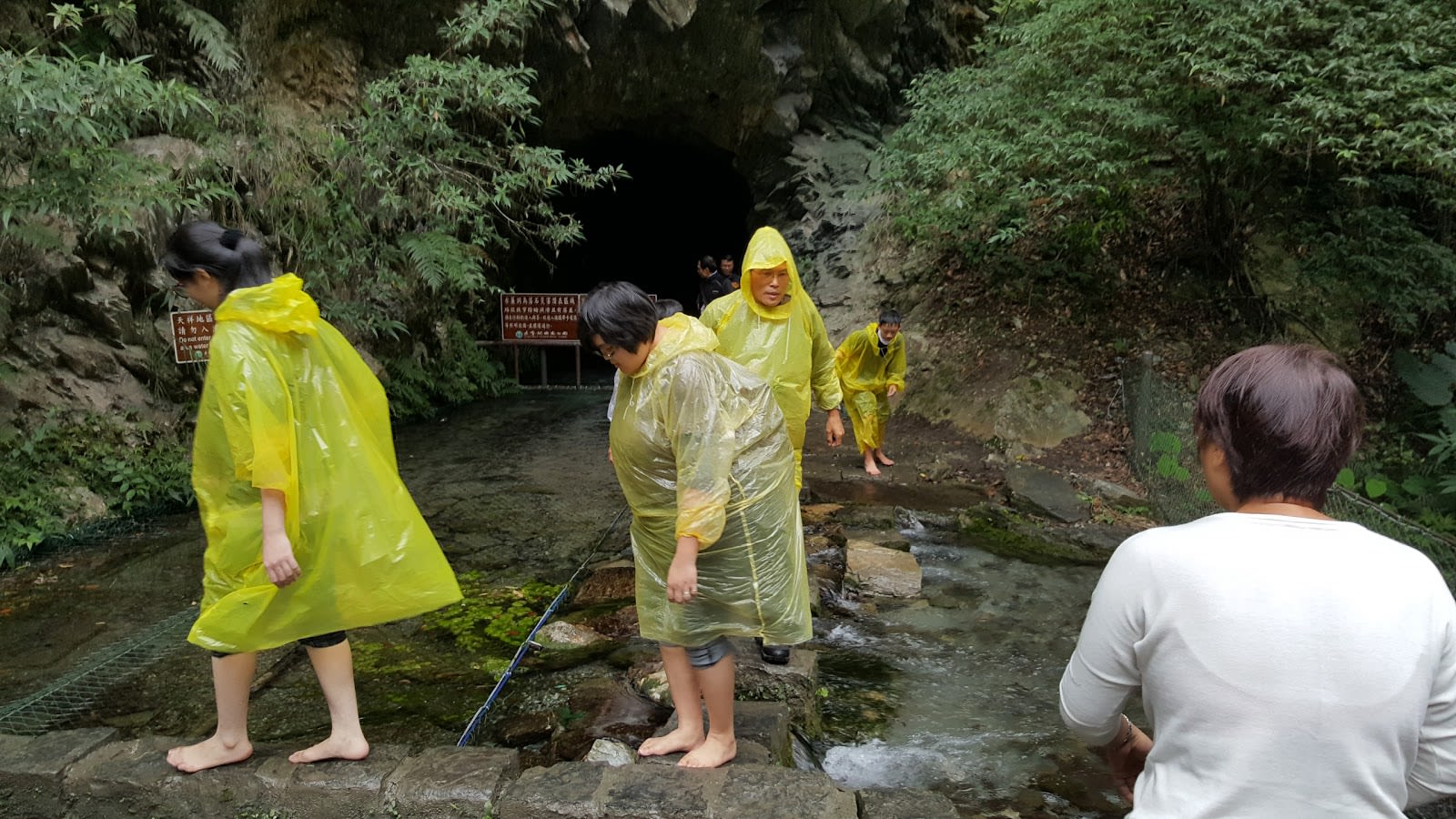 Once we arrived, there was a running water that covered the entrance to a cave. Everyone was taking off their shoes and putting on ponchos before getting in. We picked up some ponchos on the way, but didn’t have anyway of drying our feet when we got out, so some of us went with shoes and some didn’t. In the end we all had wet feet anyway, so I guess it didn’t matter either way.