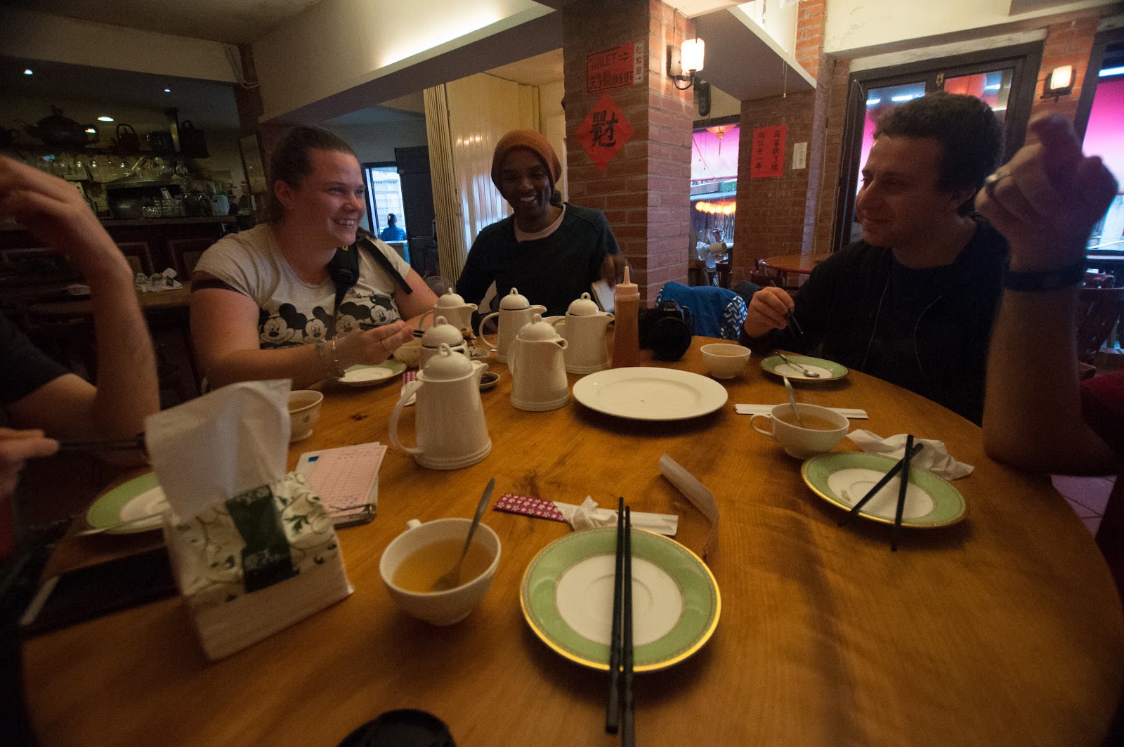 As we were walking the rain started picking up and just as we arrived at the town square we found a shop selling umbrellas for those who didn’t have any. Even though it was raining, the town square looked really nice. We started climbing the nearby stairs amongst a bustling crowd of people, there were umbrellas everywhere! On the stairs there were a few restaurants, we ended up stopping at a dumpling place and hoped the rain would blow over while we ate. The staff at the restaurant didn’t speak much English, but we managed to order some dumplings and nice warm tea for all of us, the only problem was that they interpreted “six teas” as “six tea pots”! There was so much tea we ended up paying more for tea than we did for food.