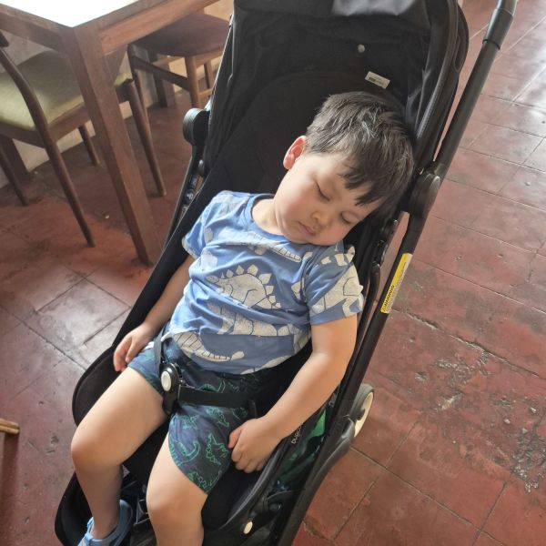 Steve looked on google maps and we found a little cafe called Bistro Tang with a heritage frontage. It was cute inside and also a place you could stay. We just ordered satay and some noodles. Luca was already sleeping when we got there but we woke him when the food came. There were toys for the kids to play with which they enjoyed and liked to explore the place.